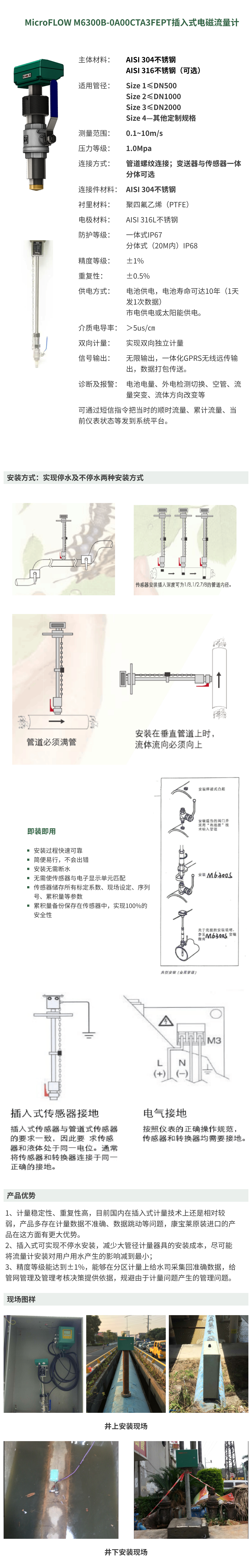 本產品是一款專為市政污水、工業(yè)廢水等導電液體流量測量設計的高可靠性、微型化分體式插入電磁流量計。它采用電磁感應原理,結合帶壓開孔、不停水安裝技術,MicroFLOW M6300B-0A00CTA3FEPT解決了大口徑管道流量測量中安裝困難、費用高昂的行業(yè)痛點,特別適用于現有管線的改造與計量。 其核心優(yōu)勢在于采用了高度集成的微型轉換器(內部核心線路板尺寸:長48mm×寬43mm×厚23mm),使得整套系統(tǒng)結構更緊湊、響應更迅速、穩(wěn)定性更高。同時,分體式設計允許轉換器遠傳安裝,便于在控制中心集中管理和查看數據,非常適合條件惡劣的安裝地點。