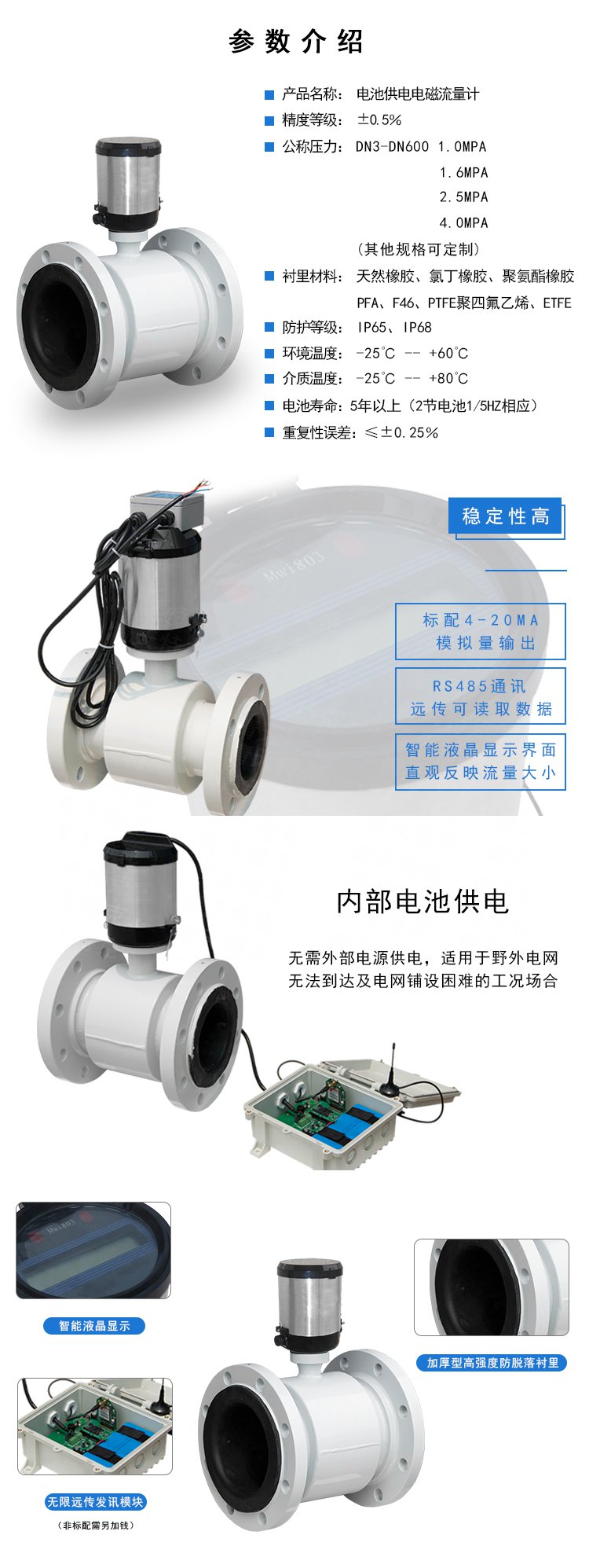 電池供電電磁流量計(jì)是為供水企業(yè)實(shí)際要求而專(zhuān)門(mén)設(shè)計(jì)的計(jì)量?jī)x表??梢?xún)?yōu)化供水用水和確保準(zhǔn)確的水貿(mào)易計(jì)量結(jié)算。符合ISO9104和ISO4064標(biāo)準(zhǔn),測(cè)量精確,可靠性高,穩(wěn)定性好,壽命長(zhǎng)。