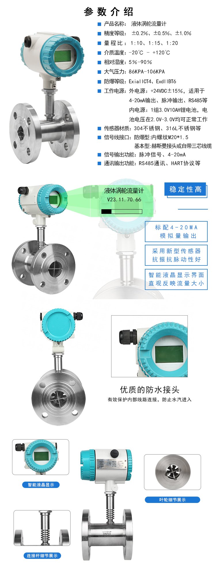 液體渦輪流量計(jì)結(jié)構(gòu)為防爆設(shè)計(jì),可以顯示流量總量,瞬時(shí)流量和流量滿度百分比。