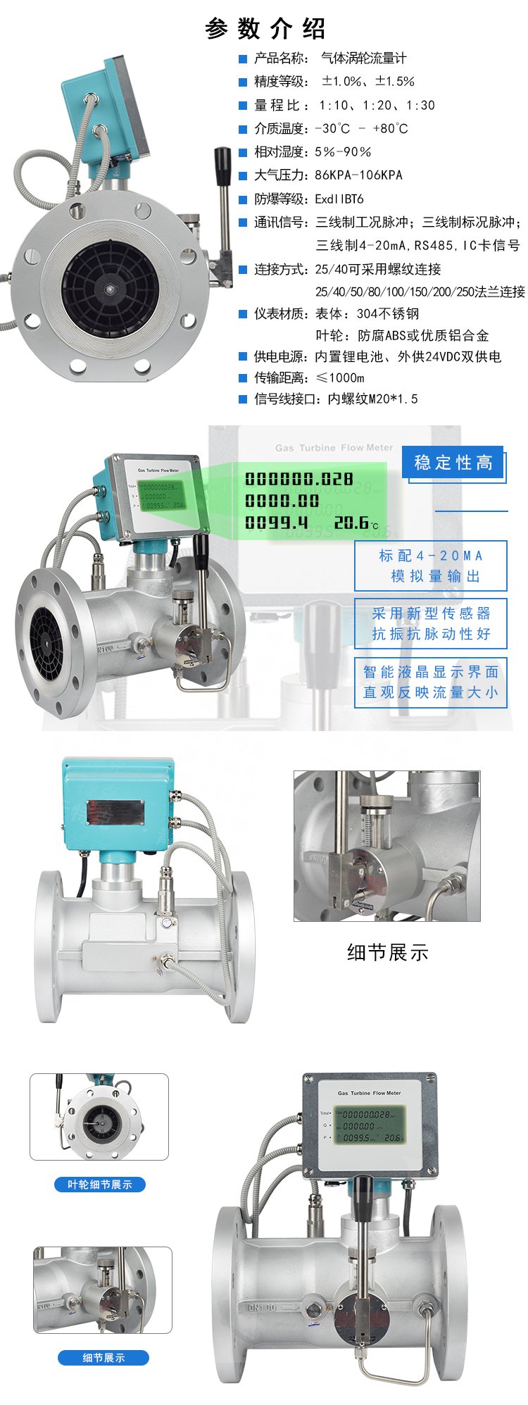 儀表參數(shù)能長期穩(wěn)定。氣體渦輪流量計(jì)采用壓電應(yīng)力式傳感器可靠性高可在-20℃~+100℃的工作溫度范圍內(nèi)工作。
