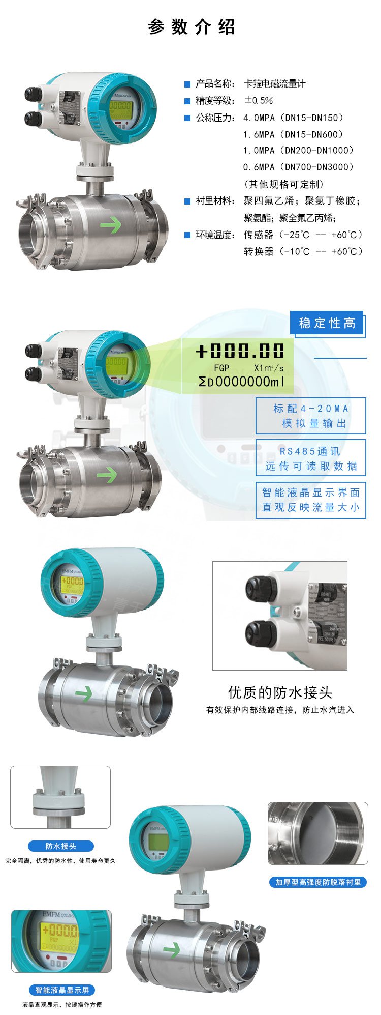 CQTLD卡箍式電磁流量計(jì)根據(jù)法拉第電磁感應(yīng)定律進(jìn)行流量測(cè)量。電磁流量計(jì)的優(yōu)點(diǎn)是壓損極小,可測(cè)流量范圍大。最大流量與最小流量的比值一般為20:1以上,適用的工業(yè)管徑范圍寬,輸出信號(hào)和被測(cè)流量呈線性,精確度較高,可測(cè)量電導(dǎo)率≥5μs/cm的液體。